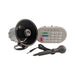 - Public address system using the included microphone with push-button activation (not a slide switch). Microphone also includes a convenient stand when no in use